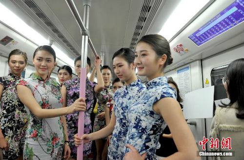 12月4日,武汉地铁2号线一列看似普通的列车车厢瞬间变T台,22名大学生模特身着旗袍和晚礼服上演了一场地铁时装秀,吸引不少乘客观看。中新社记者 张畅 摄