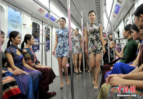 12月4日,武汉地铁2号线一列看似普通的列车车厢瞬间变T台,22名大学生模特身着旗袍和晚礼服上演了一场地铁时装秀,吸引不少乘客观看。中新社记者 张畅 摄
