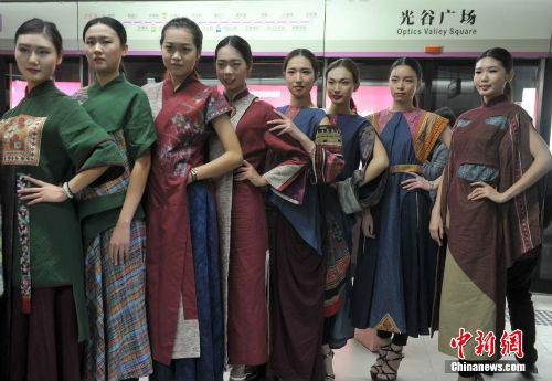 12月4日,武汉地铁2号线一列看似普通的列车车厢瞬间变T台,22名大学生模特身着旗袍和晚礼服上演了一场地铁时装秀,吸引不少乘客观看。中新社记者 张畅 摄