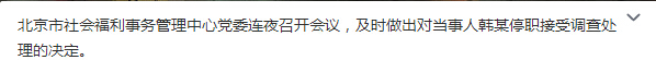 同时回应称,北京市社会福利事务管理中心党委、纪委态度明确,本着对当事人高度负责的原则,将实事求是依法依规严肃查处,相关结果待认定后及时向社会公布。