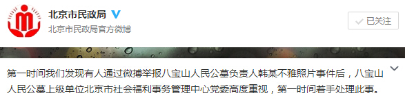 北京市民政局表示,第一时间发现有人通过微搏举报八宝山人民公墓负责人韩某不雅照片事件后,八宝山人民公墓上级单位北京市社会福利事务管理中心党委高度重视,第一时间着手处理此事。北京市社会福利事务管理中心党委连夜召开会议,及时做出对当事人韩某停职接受调查处理的决定。
