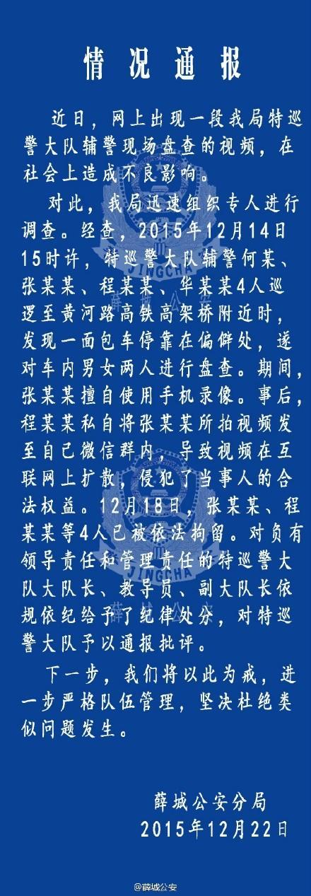 经查,2015年12月14日15时许,特警大队辅警何某、张某某、程某某、华某4人巡逻至黄河路高铁高架桥附近时,发现一面包车停靠在偏僻处,遂上前对车内男女两人进行盘查,期间张某某擅自使用手机录像,其间,程某某私自将所拍视频发布至微信群内,导致视频在互联网上扩散,侵犯了当事人的合法权益。12月18日,张某某、程某某等4人已被依法拘留。对负有领导责任和管理责任的特巡警大队大队长、教导员、副大队长依规依纪给予了纪律处分,对特巡警大队予以通报批评。