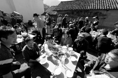 给母亲上完坟后,村中的钱姓亲戚在村中的一块空地摆出了十余张小桌子,布置好饭菜、碗筷后,钱仁风和钱智远等钱家亲属纷纷落座。“按照习俗,本来要咱家出钱请这些亲戚吃顿饭的,但是现在家里条件太差,所以这些亲朋就自发地每家做一份菜,凑了这么几桌。”钱智远告诉身旁的钱仁风。