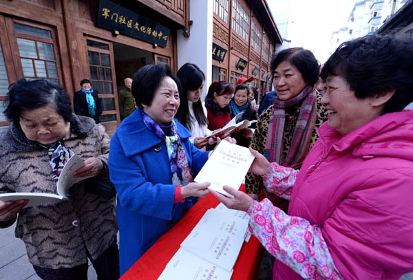 2015年1月16日,鼓楼区军门社区党委书记林丹(左二)向社区居民赠阅《习近平关于党风廉政建设和反腐败斗争论述摘编》一书。当日,《习近平关于党风廉政建设和反腐败斗争论述摘编》一书在福建福州各大新华书店上架,深受广大党员干部和群众的欢迎。 (图片来源:新华社)