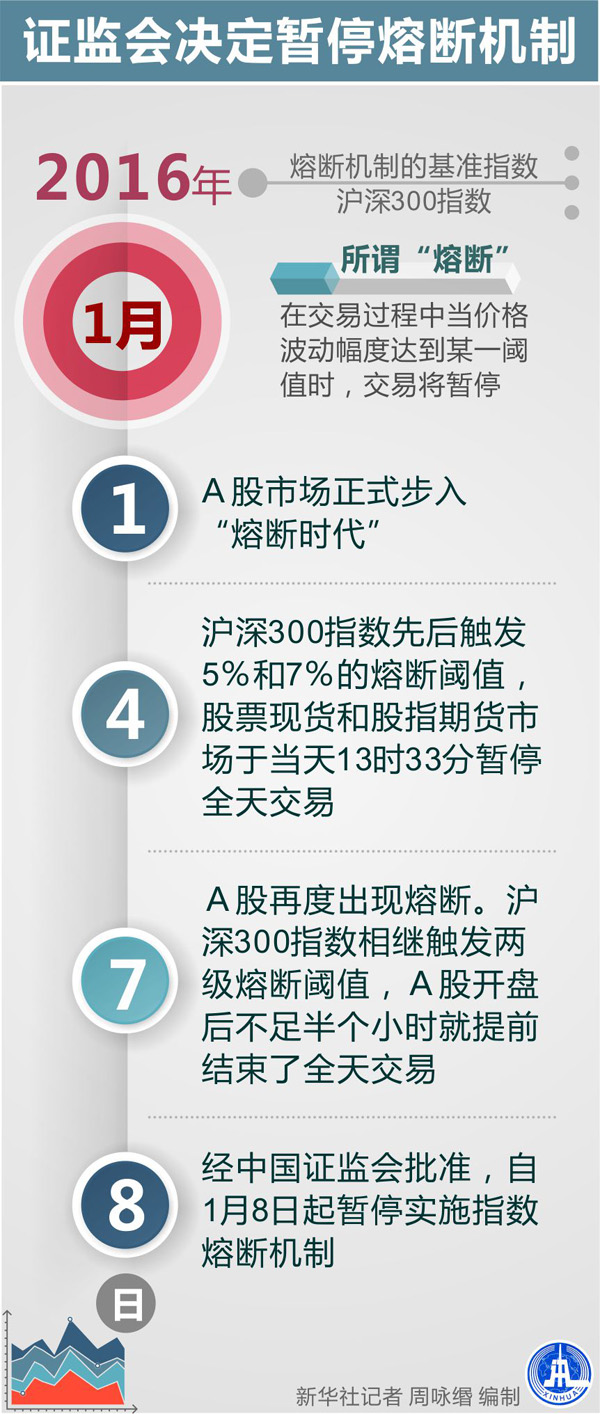 新华社北京1月7日电(记者赵晓辉、许晟)上海证券交易所、深圳证券交易所、中国金融期货交易所7日晚间宣布,为维护市场稳定运行,经中国证监会批准,自2016年1月8日起暂停实施指数熔断机制。