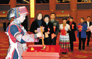 人大代表们依次走向投票箱,投下神圣庄严的一票。 记者杨艳辉摄