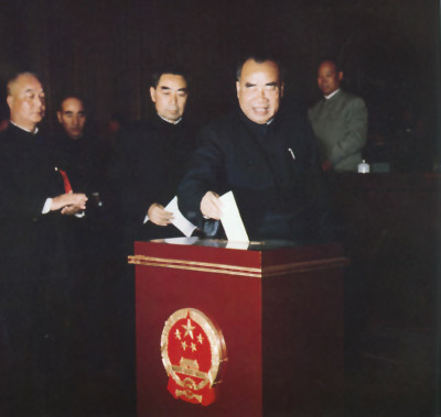 1959年4月,朱德在第二届全国人大第一次会议上当选为全国人民代表大会常务委员会委员长。这是朱德、周恩来等在投票。