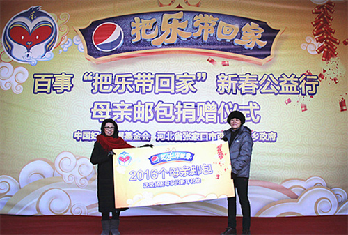 千龙网讯 2016年1月25日, “把乐带回家——母亲邮包”启动仪式在河北张家口市怀安县西沙城乡举行。中国妇女发展基金会(以下简称“妇基会”)领导、百事公司高层、百事明星及主流媒体为当地贫困母亲捐赠出2016份凝聚爱心的“母亲邮包。同时,百事公司还联合腾讯公益平台,号召全国网友为贫困地区的母亲捐赠,共创一个祥和、温暖、快乐的猴年春节。
