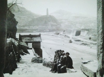 徐佛观坐在延安交际处,远处就是宝塔山。