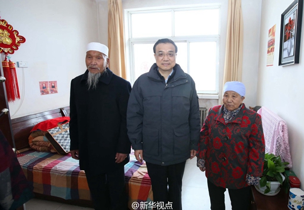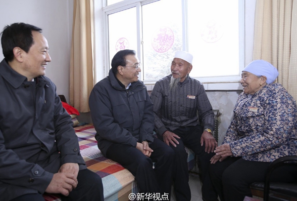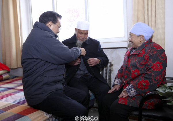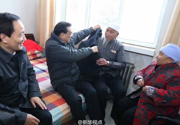 李克强帮78岁的回族五保老人海保廷穿上新衣,又细心帮他系上纽扣。1日,农历小年,李克强来到宁夏固原市原州区中心敬老院,看望海保廷、马正秀老两口,并给他们带来两件新衣作为新年礼物。总理对两位老人说,祝你们身体健康,新年有新气象!