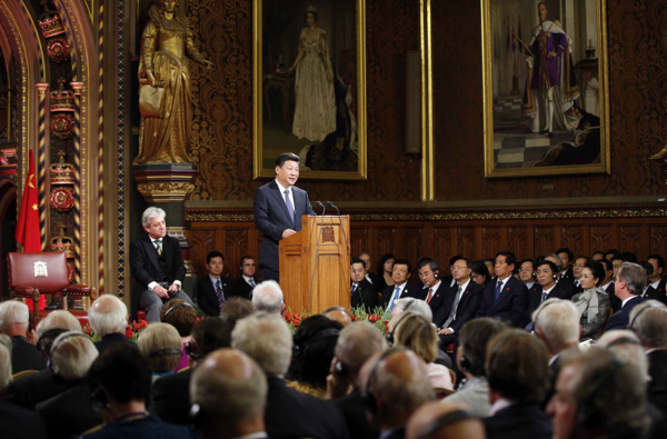 图为:2015年10月20日,国家主席习近平在英国议会发表讲话。