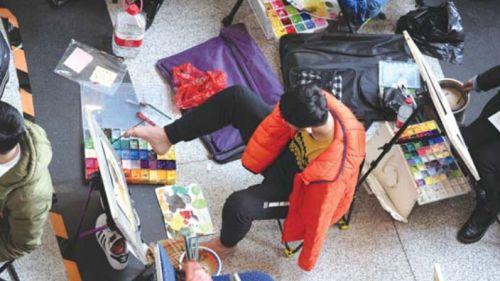 16日,在济南舜耕国际会展中心,山东工艺美术学院组织的设计美术类考试正在进行,近7000名考生同堂竞技,争取获得该校的校考合格证。