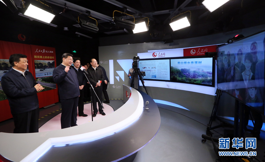 2月19日,中共中央总书记、国家主席、中央军委主席习近平在北京主持召开党的新闻舆论工作座谈会,并到中央新闻单位调研。这是习近平在人民日报社人民网演播室,通过视频同福建省宁德市赤溪村村民交流。新华社记者 兰红光 摄