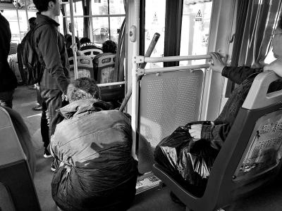 车辆启动、前行,当报站器报出到达“七一路口西”时,农民工模样的中年男乘客起身,提着铁锹走到后门,下车。记者询问他有座位不坐的原因时,这位不愿透露姓名的农民工兄弟称,他也没想那么多,只是觉得自己身上脏,不想打扰人家。