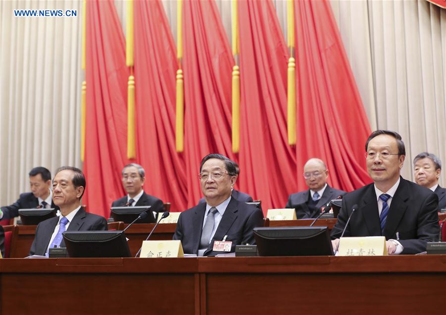 Yu Zhengsheng (C), chairman of the National Committee of the Chinese People's Political Consultative Conference (CPPCC), attends a meeting of the Standing Committee of the CPPCC National Committee in Beijing, capital of China, Feb. 28, 2016. The Standing Committee of the CPPCC National Committee gathered on Sunday for a meeting and approved a decision to open the fourth annual session of the 12th CPPCC National Committee on March 3. [Photo/Xinhua]