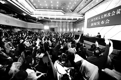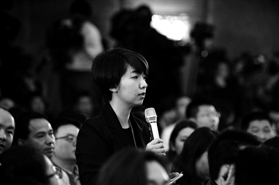 北京青年报记者在人大发布会现场提问 供图/新华网