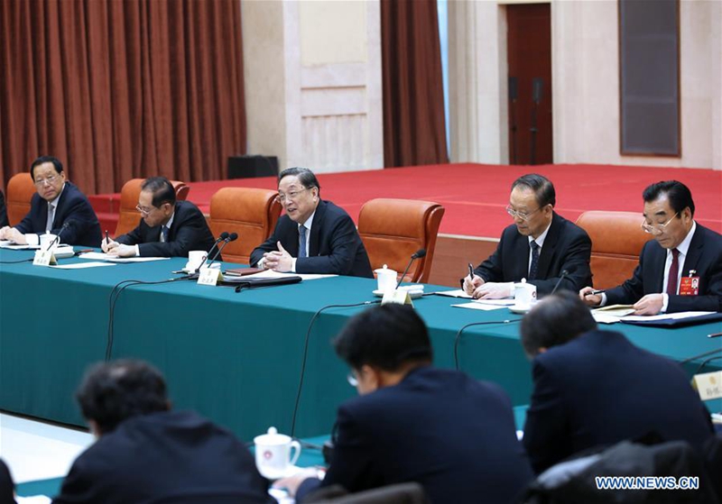 Yu Zhengsheng (3rd L), chairman of the National Committee of the Chinese People's Political Consultative Conference, joins a panel discussion with political advisors from medical and health care sector during the ongoing annual session of the country's top political advisory body in Beijing, capital of China, March 4, 2016. [Photo/Xinhua]