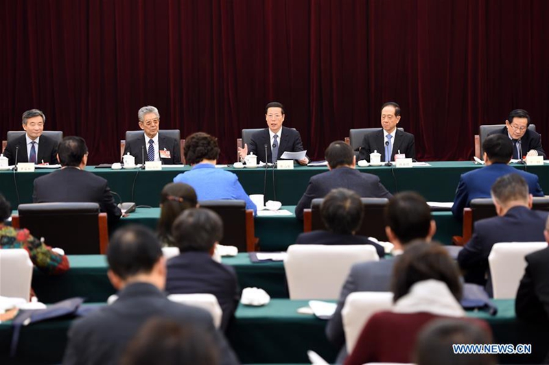 Zhang Dejiang (C, rear), chairman of the Standing Committee of China's National People's Congress (NPC), joins a panel discussion with political advisors from Hong Kong and Macao, two special administrative regions, during the ongoing annual session of the country's top political advisory body in Beijing, capital of China, March 4, 2016. [Photo/Xinhua]