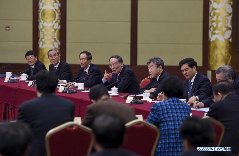 Wang Qishan (4th L, back), a member of the Standing Committee of the Political Bureau of the Communist Party of China (CPC) Central Committee and secretary of the CPC Central Commission for Discipline Inspection, joins a panel discussion with political advisors from the CPC during the ongoing annual session of the country's top political advisory body in Beijing, capital of China, March 4, 2016. [Photo/Xinhua]