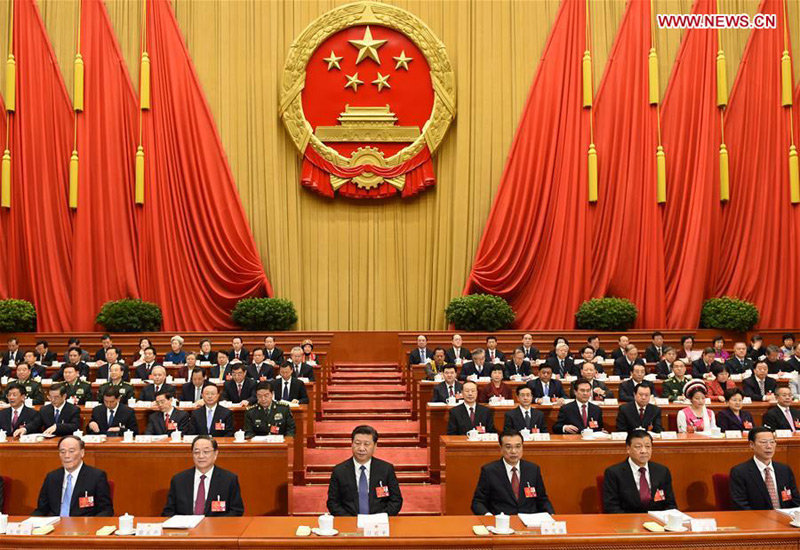 Top Communist Party of China and state leaders Xi Jinping (3rd L, front), Li Keqiang (3rd R, front), Yu Zhengsheng (2nd L, front), Liu Yunshan (2nd R, front), Wang Qishan (1st L, front) and Zhang Gaoli (1st R, front) attend the opening meeting of the fourth session of the 12th National People's Congress at the Great Hall of the People in Beijing, capital of China, March 5, 2016. [Photo/Xinhua]