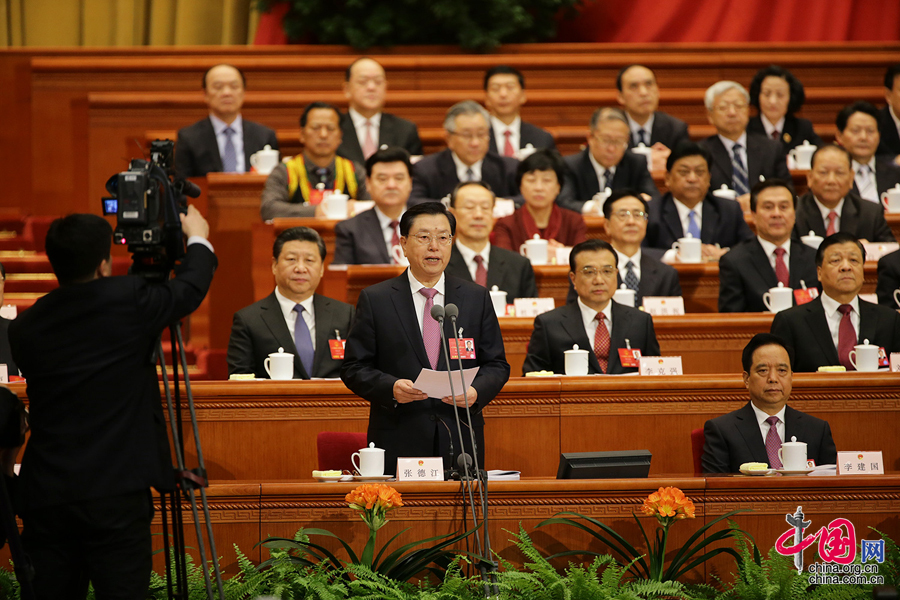 Zhang Dejiang, chairman of the Standing Committee of China's National People's Congress (NPC), presides over the opening meeting of the fourth session of the 12th NPC at the Great Hall of the People in Beijing, capital of China, March 5, 2016. [Photo/China.org.cn]