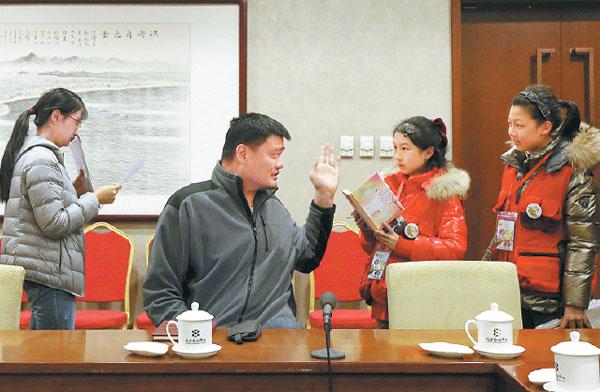 Yao Ming, former NBA basketball star and a member of the CPPCC National Committee, talks to two students sent by Hebei Youth Daily to report on the annual meetings on Friday.[Photo/China Daily]