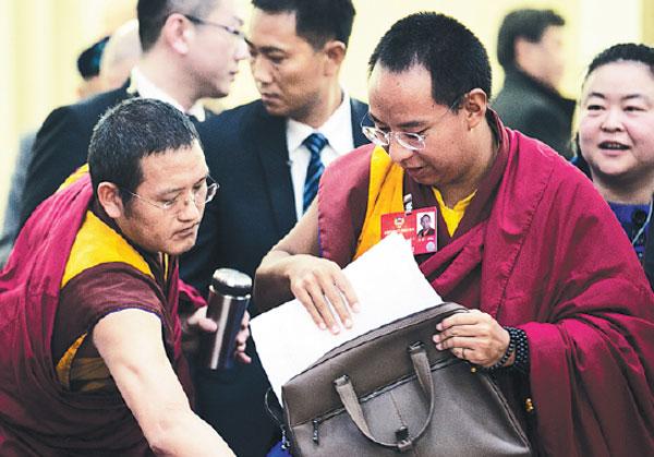 The 11th Panchen Lama (right), Bainqen Erdini Qoigyijabu, gets ready to leave after attending a panel discussion of the CPPCC National Committee on Friday.[Photo/China Daily]