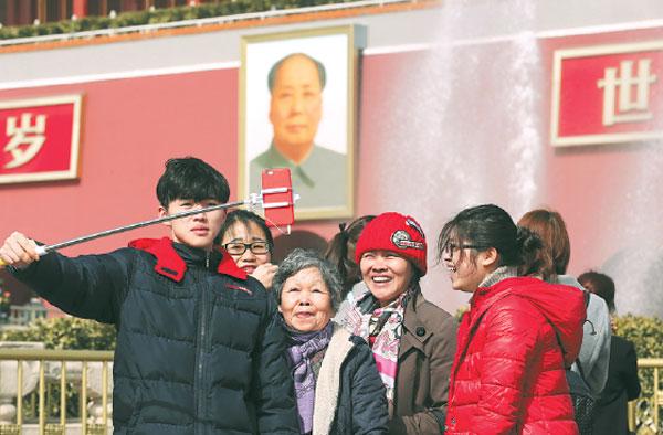 Tourists take a picture in front of the Tian'anmen Rostrum on Saturday, when the NPC opened its annual plenary session.[Photo/China Daily]