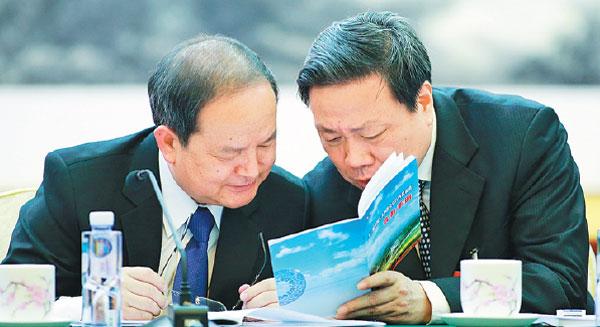 Lu Xinshe (left), governor of Jiangxi province, and Shang Yong, Party chief of the China Association for Science and Technology, during a meeting on Saturday. [Photo/China Daily]