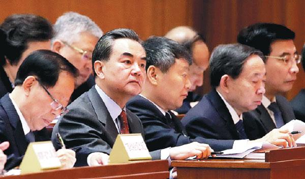 Foreign Minister Wang Yi (second from left) at the opening meeting of the NPC's annual session on Saturday. [Photo/China Daily]