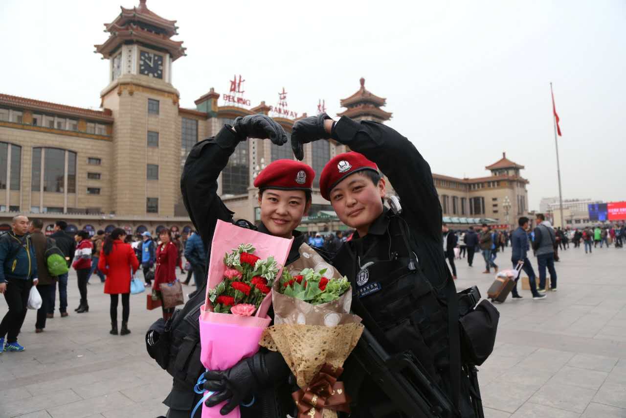 在岗位上收到鲜花的女突击队员们高兴摆出萌萌pose。
