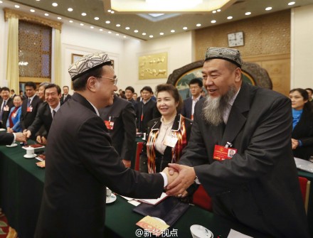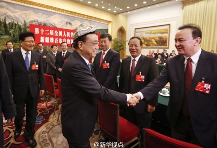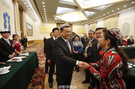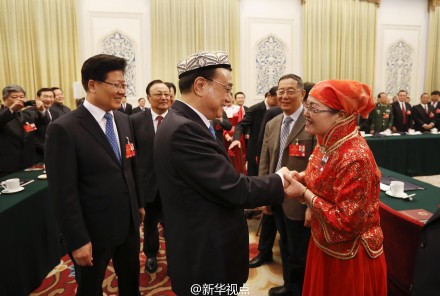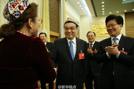新华网北京3月10日电 3月10日上午,中共中央政治局常委、国务院总理李克强参加十二届全国人大四次会议新疆维吾尔自治区代表团审议。现场一位维吾尔族女代表为总理戴上一顶花帽。总理亲切跟大家打招呼,与代表们一一握手。他说:“你们从很远的地方来,我要和每位代表握握手!”(据新华社“新华视点”微博报道)