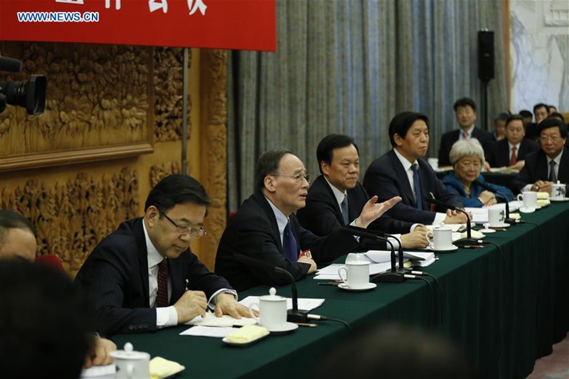 Wang Qishan, a member of the Standing Committee of the Political Bureau of the Communist Party of China (CPC) Central Committee and secretary of the CPC Central Commission for Discipline Inspection, joins a group deliberation of deputies from Guizhou Province to the annual session of the National People's Congress in Beijing, capital of China, March 11, 2016. [Photo/Xinhua]