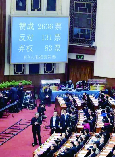 今天(3月16日)上午,十二届全国人大四次会议表决通过慈善法草案,其中赞成2636票 摄/记者 李洪鹏