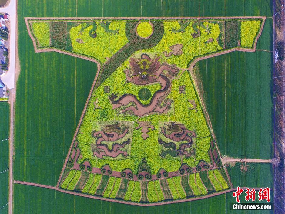 3月21日,农民在田野内“编织”“龙袍”。南京六合油菜花盛开,当地农民加紧制作巨型“龙袍”和“双龙戏珠”迷宫,从空中俯瞰,颇为震撼。中新社记者 泱波 摄