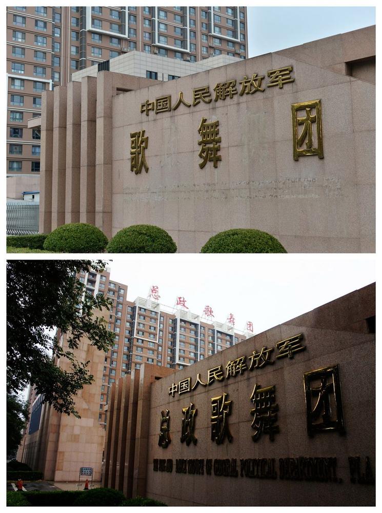 北京西三环北路,摘牌后的中国人民解放军歌舞团(上),和原中国人民解放军总政歌舞团。