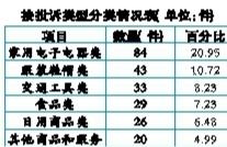 据了解,根据投诉性质(如表所示)分类,在所有投诉问题中,质量问题占41.9%。产品质量、合同、价格、售后服务问题和虚假宣传仍是引发投诉的主要原因,占投诉总量的76.81%。根据投诉类型(如表所示)分类,在所有投诉问题中,因家用电子电器类产品多、使用频繁等原因,投诉量一直占据前列。服装鞋帽类、交通工具类、食品类及日用商品类等四类投诉分别居第二到第五名。投诉类型前五名的投诉数量,占投诉总量的53.61%。