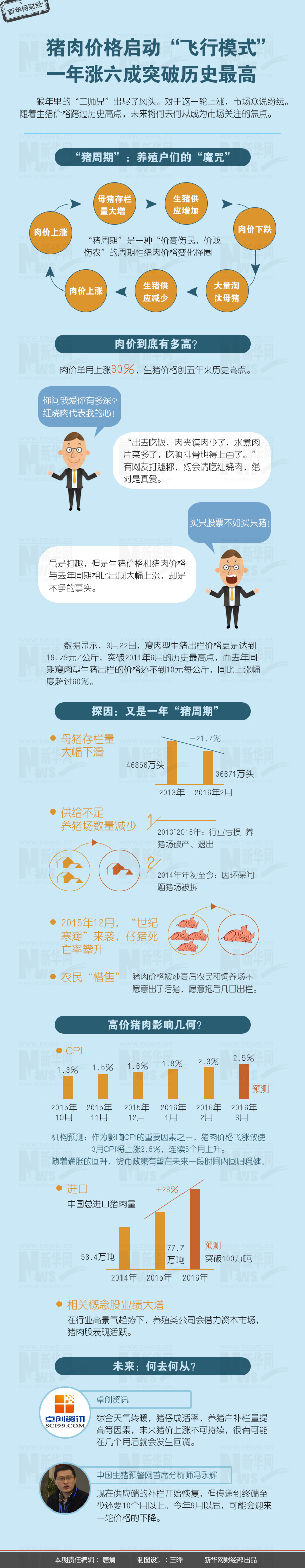 2010年4月“猪你涨”开始发力20个月,在2012年1月开始迎来下跌,中国生猪养殖业也迎来史上最长亏损“猪周期”,历经三年多的低谷期直到2015年3月进入上涨通道。专家分析指出,过去十几年里的三次完整“猪周期”,每轮周期中上涨均维持在20个月左右。以此类推,本轮猪肉价格将在2016年全年保持高位态势。