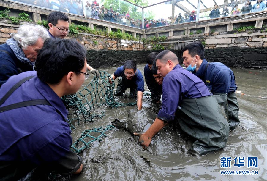4月7日,中外动物专家和饲养员将苏州动物园池塘内的雌性斑鳖抬上岸。
