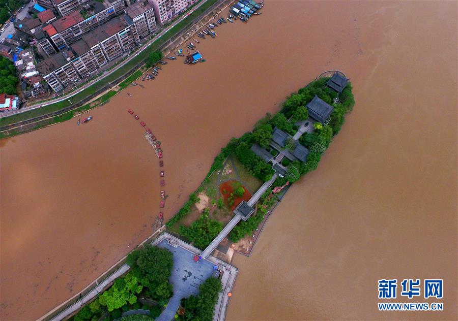 4月18日拍摄的被洪水围困的湖南衡阳石鼓书院。湖南省防汛抗旱指挥部消息,进入4月中旬以来,湖南省出现大范围强降雨,暴雨集中在湘中以北地区、湘南局地,暴雨导致局地洪涝。截至17日12时,该省有38.7万人受灾,4人因灾死亡,5761人被紧急转移安置,903间房屋倒塌。新华社发(彭斌 摄)