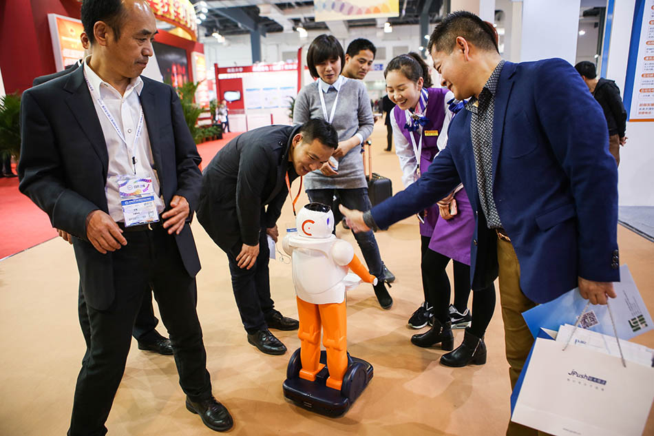 上交会现场,观众与展商带来的机器人互动。 本届上交会以“创新驱动发展,保护知识产权,促进技术贸易”为主题。现在的VR设备,3D打印和尖端医疗设备引来不少围观。
