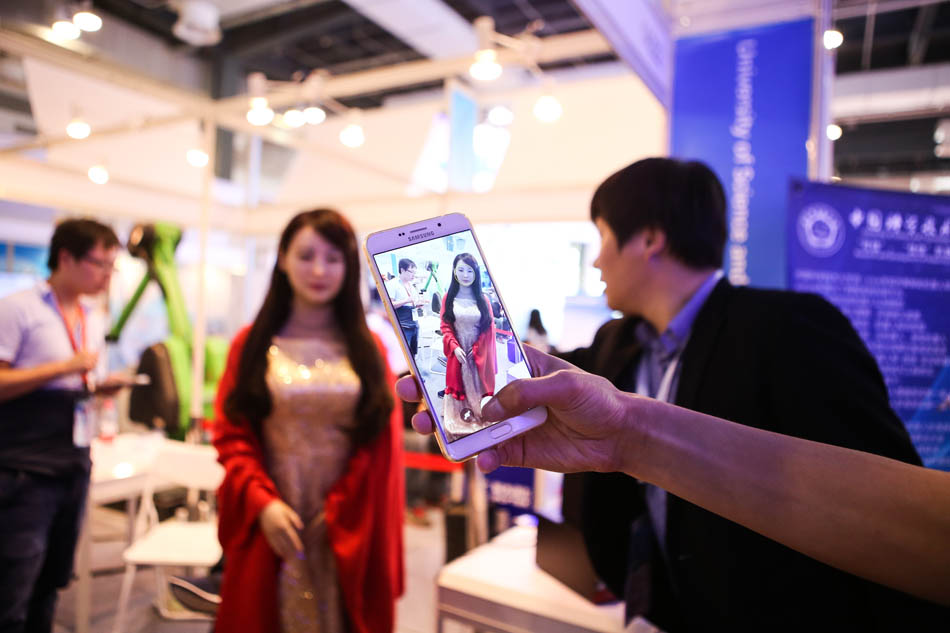 展会上“佳佳”向观众眨了眨眼,点了点头。展商介绍说她现在是自动模式,说话和做动作得看她的心情,她现在累了不想动了。