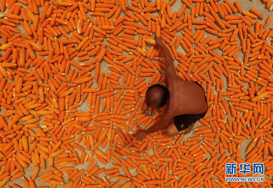 2015年7月15日,大化瑶族自治县板升乡弄勇村弄顶屯村民蓝玉法在房顶晒玉米。新华社记者黄孝邦摄