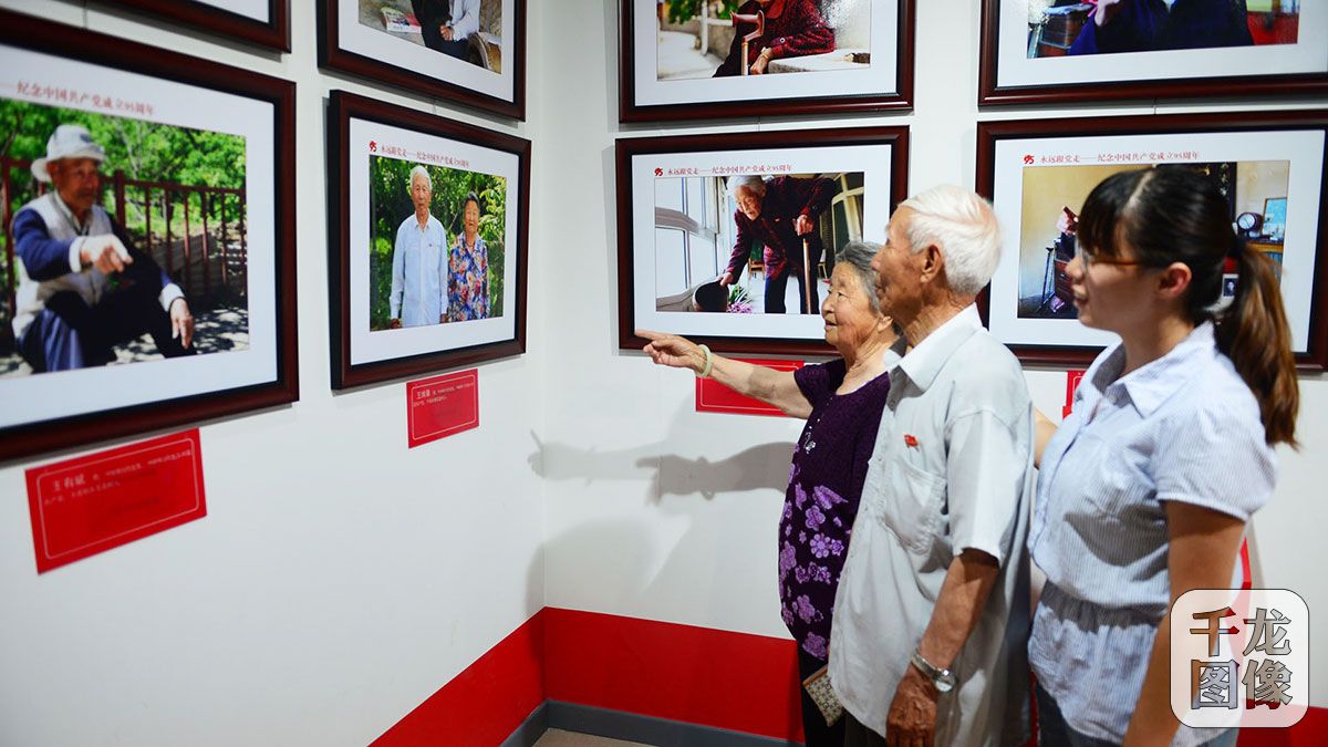 6月27日,延庆区《永远跟党走—纪念中国共产党成立95周年老党员风采展》向公众开放。图为亲临现场的老党员在家人的陪伴下参观展览并在自己的照片前回忆当年往事。贾德勇摄 千龙网发