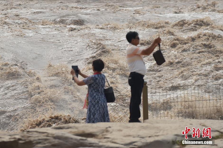 7月5日,山西吉县壶口瀑布,游客欣赏气势磅礴的瀑布美景。受上游降雨和水库调节放水影响,黄河晋陕峡谷迎来入汛以来第一次涨水,壶口瀑布水量大增,景观壮美。中新社记者 武俊杰 摄