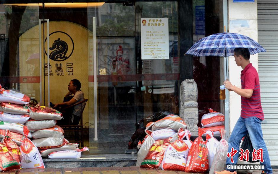 7月9日,2016年第1号台风“尼伯特”给福州带来暴雨,市民出行艰难。当天,福建省气象台发布台风警报称,“尼伯特”将于当天中午前后在泉州晋江到莆田秀屿一带沿海登陆,在福建省停留时间长,降水强度强、范围广。图为市区一沿街店家用沙袋阻挡雨水侵袭。 刘可耕 摄