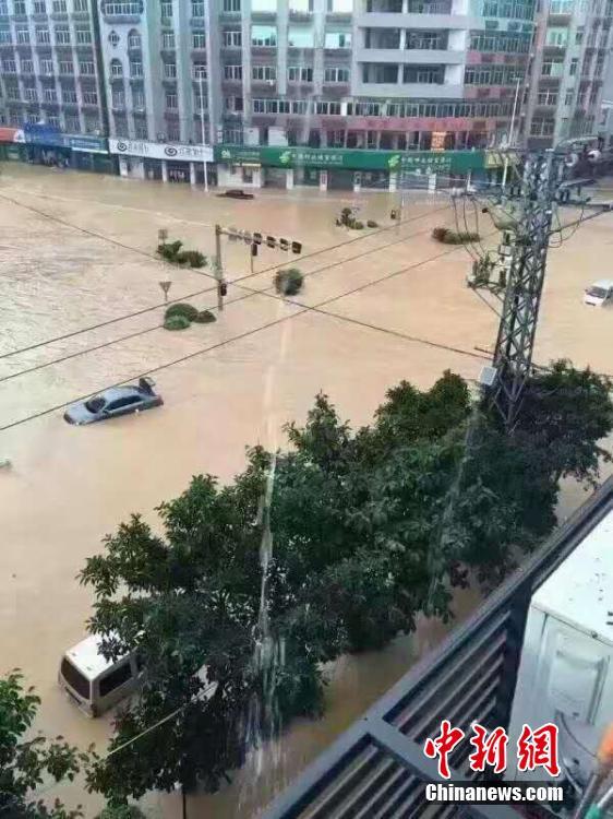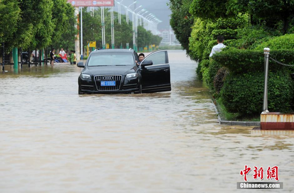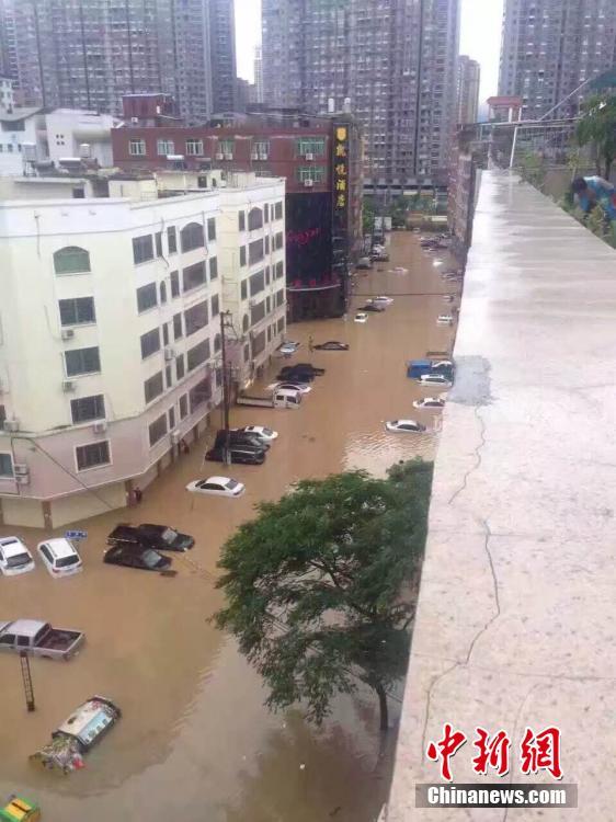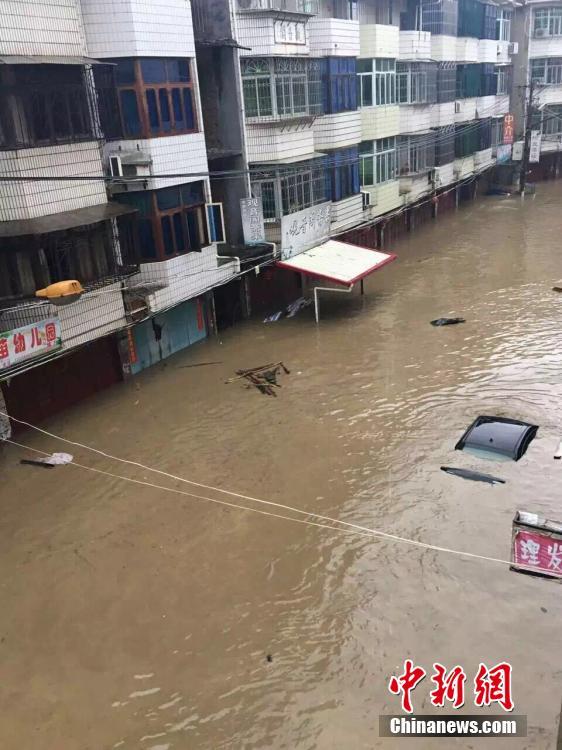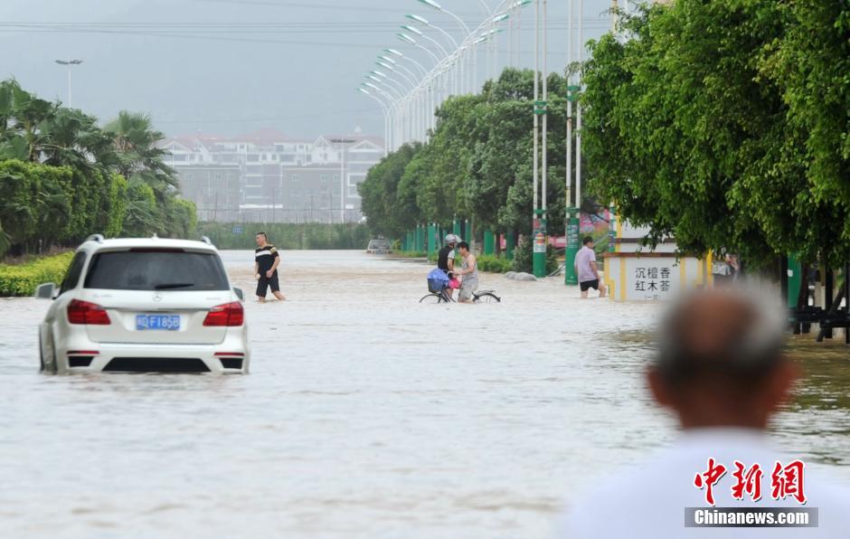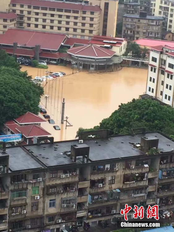 7月9日13时45分,今年第1号台风“尼伯特”以强热带风暴级在福建石狮沿海登陆,中心最大风力10级(25米/秒)。受其影响,福建中部沿海地区发生暴雨到大暴雨,局部特大暴雨,造成莆田、闽清、永泰等多地内涝严重。图为莆田市区街道内涝严重。 中新社记者 吕明 摄