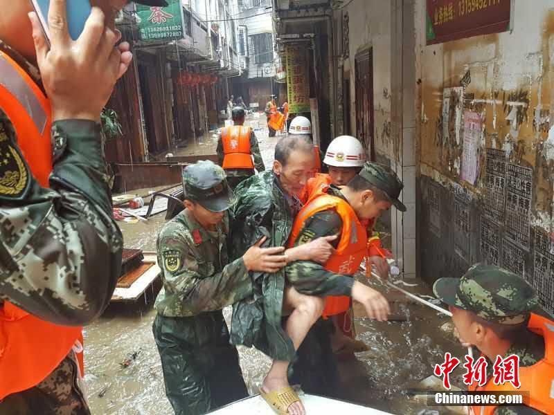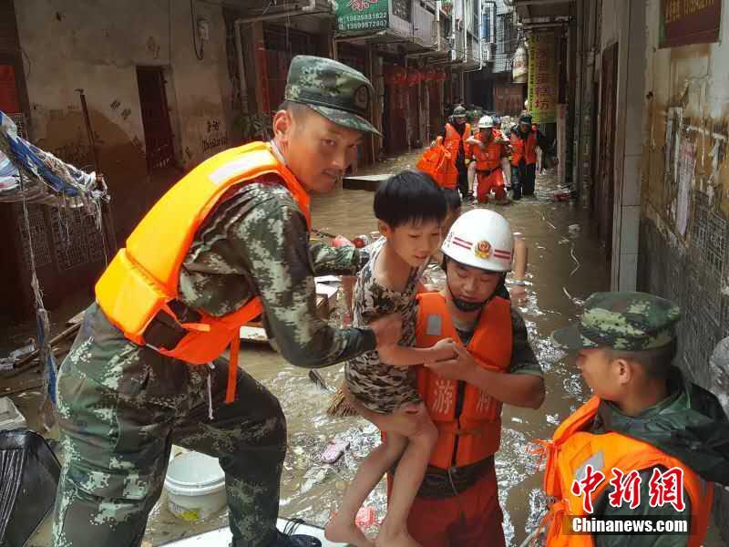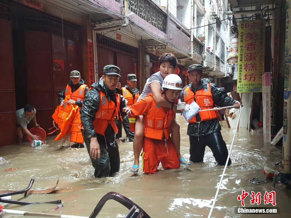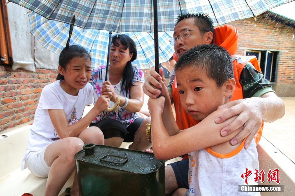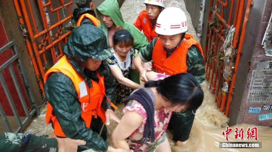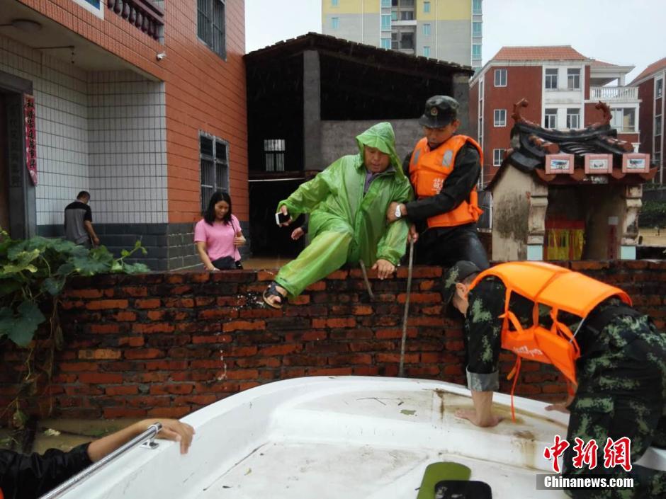 7月8日夜间开始,“尼伯特”便为福建带来疾风骤雨。据8日7时至9日7时统计,全省降雨量50~100毫米有6个县(市、区),超100毫米有10个县(市、区),以城厢区266毫米为最大。受强降雨影响,福建莆田市、福州市永泰县、闽清县等多地发生严重内涝。在重灾区莆田市荔城区新度镇,多处道路、民房均被淹,导致多人被困,当地消防官兵推船进村、救出被困民众。图为救援官兵救出被困村民。 汤珺琳 摄