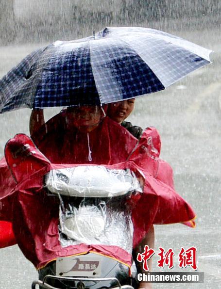 7月9日,2016年第1号台风“尼伯特”给福州带来暴雨,市民出行艰难。当天,福建省气象台发布台风警报称,“尼伯特”将于当天中午前后在泉州晋江到莆田秀屿一带沿海登陆,在福建省停留时间长,降水强度强、范围广。图为骑电动车的市民出行艰难。 刘可耕 摄
