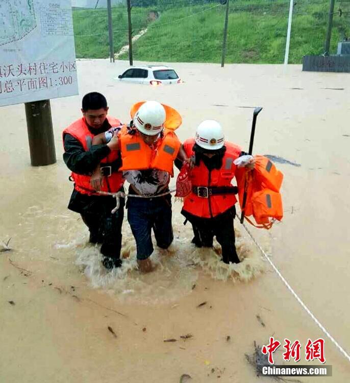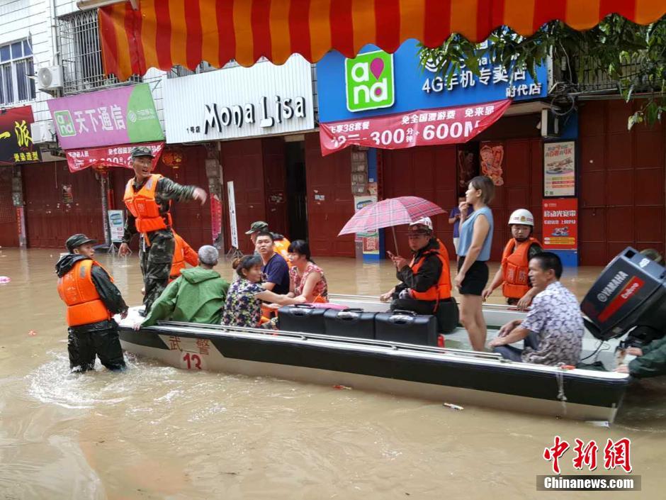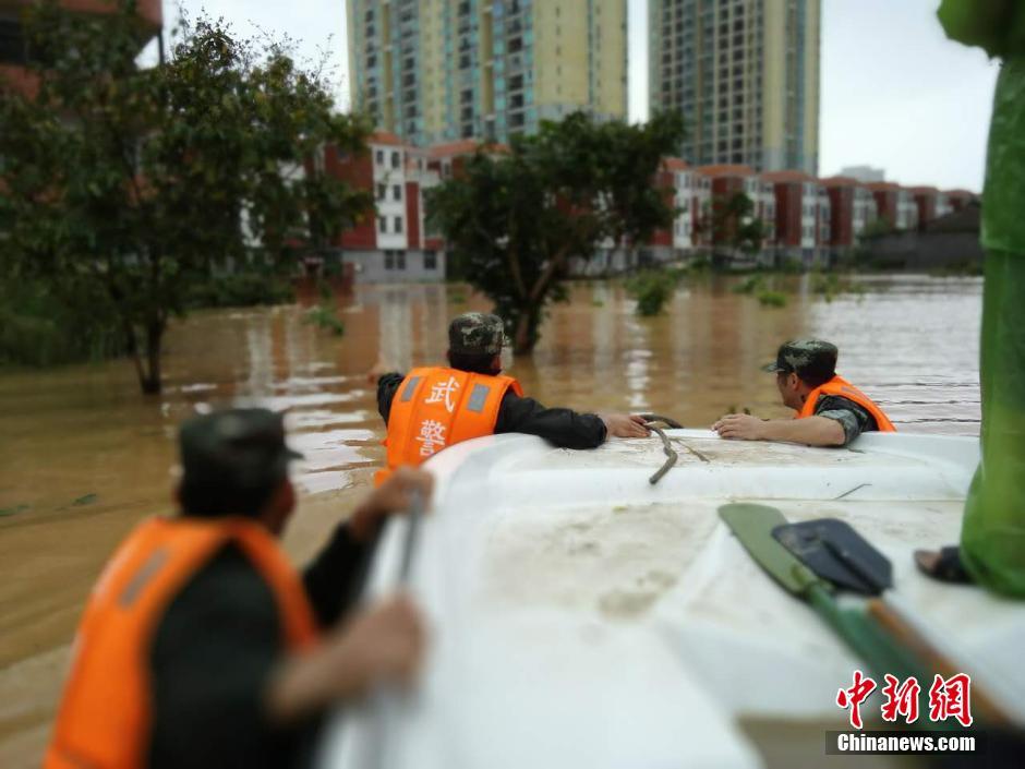 7月8日夜间开始,“尼伯特”便为福建带来疾风骤雨。据8日7时至9日7时统计,全省降雨量50~100毫米有6个县(市、区),超100毫米有10个县(市、区),以城厢区266毫米为最大。受强降雨影响,福建莆田市、福州市永泰县、闽清县等多地发生严重内涝。在重灾区莆田市荔城区新度镇,多处道路、民房均被淹,导致多人被困,当地消防官兵推船进村、救出被困民众。图为福建省气象工作者到莆田市新度镇沟尾村向救援官兵了解救援情况。 汤珺琳 摄